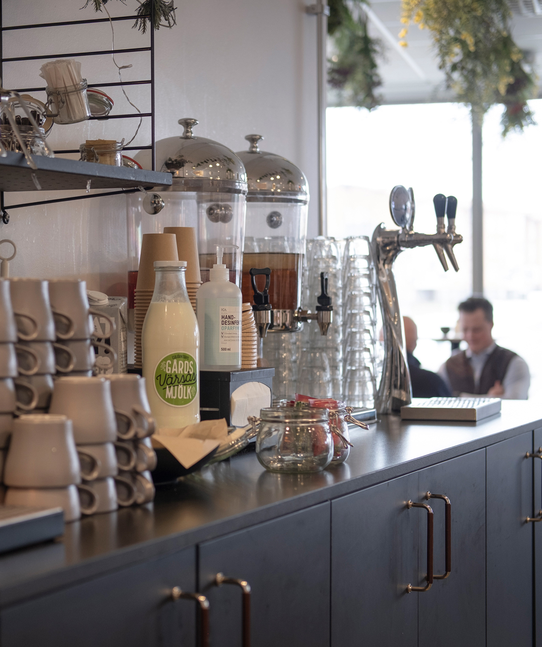 Under kontorstid finns här möjlighet att slå sig ned för fika och lättare tilltugg.