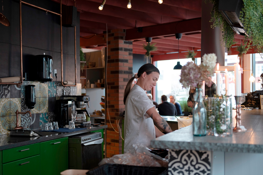 Här kan du fika eller äta. Varje dag serveras lättare lunch som soppa, sallad och grillad smörgås. Det finns även nybakade frallor med olika pålägg, hembakade kakor, godis och frukt. I kaffemaskinen kan du köpa kaffe latte, cappuccino, chailatte eller espresso under hela dagen.